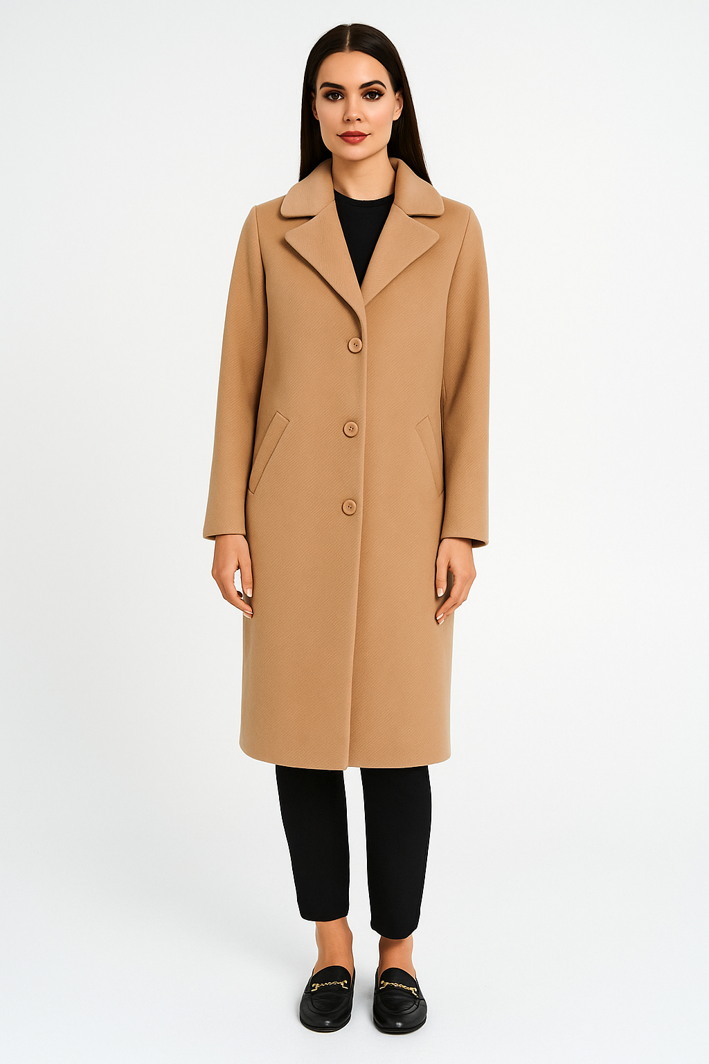 Elegantiškas klasikinis paltas su trijų sagų užsegimu – nepakeičiamas pasirinkimas šaltajam sezonui. Tiesaus kirpimo modelis su subtilia įliemenuota linija, atlapais ir šoninėmis kišenėmis. Aukštos kokybės audinys maloniai priglunda, suteikia šilumos ir komforto.