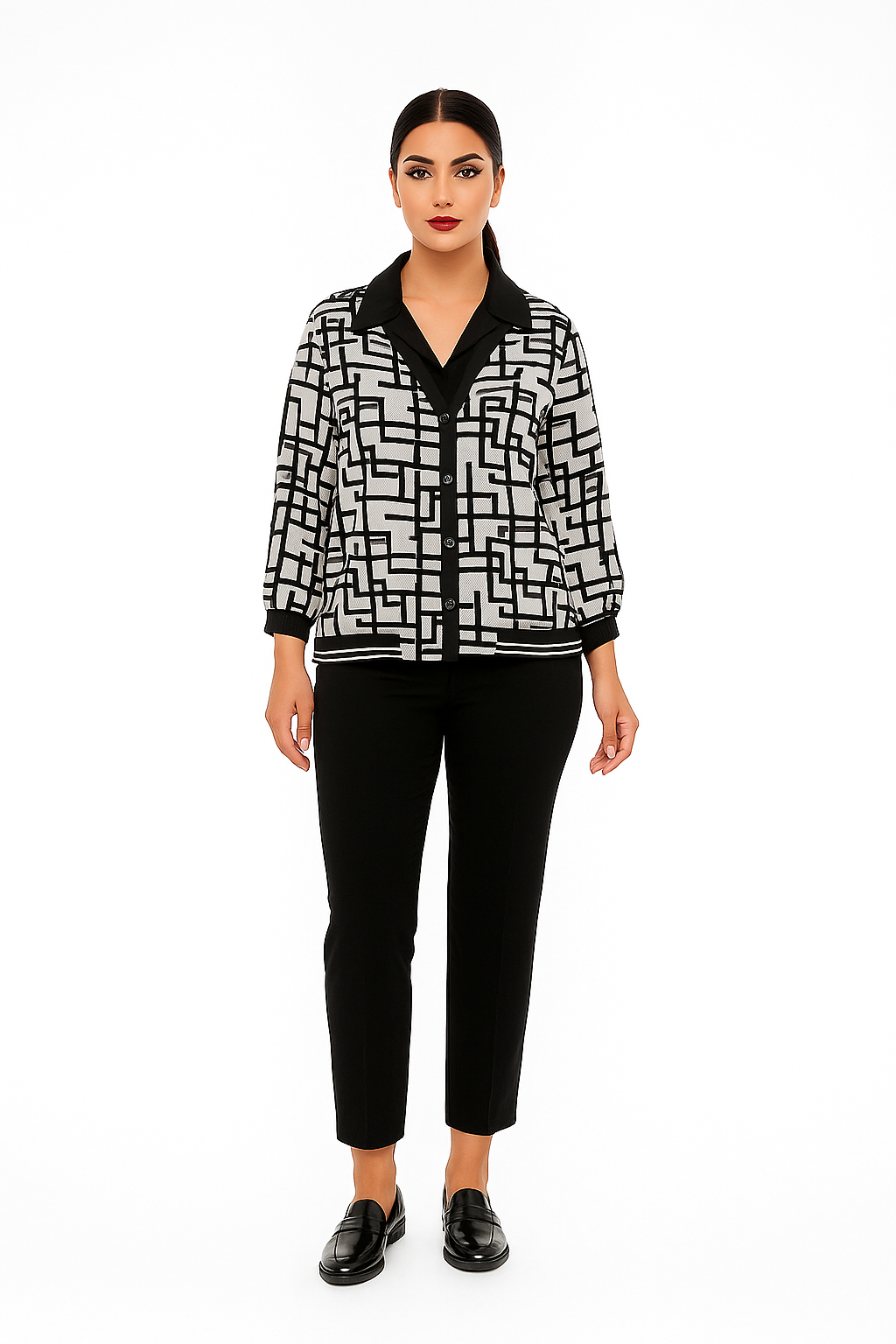 Megztukas ir marškinukai viename – idealus pasirinkimas šiam rudeniui! Derinys iš 95 % poliviskozės ir 5 % likros suteikia lengvumo, švelnumo ir patogumo, o elastanas padeda išlaikyti formą. Šokoladinė rudens spalva su grafišku raštu suteikia išskirtinumo, o klasikinis kirpimas tinka tiek darbui, tiek laisvalaikiui.