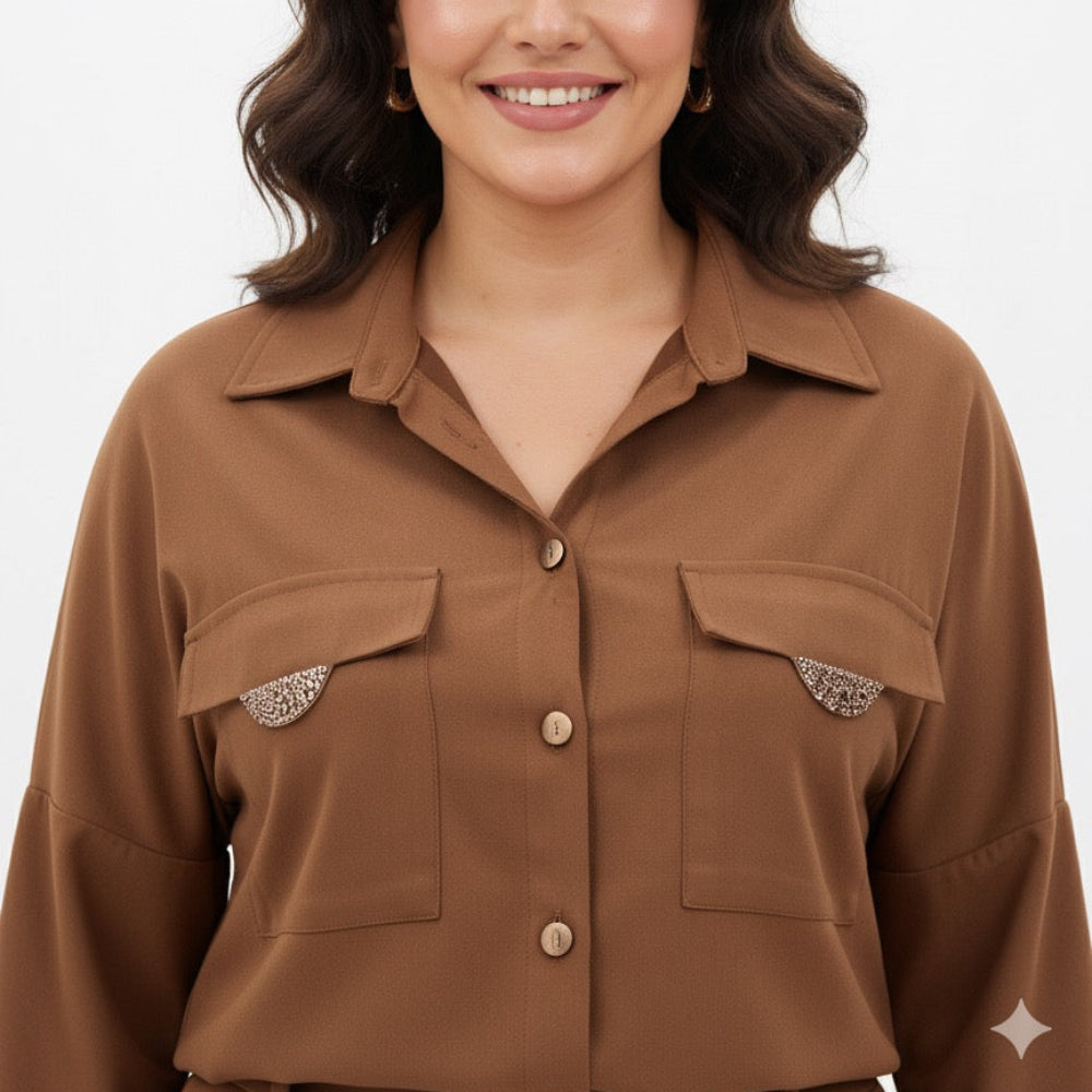 Elegantiški rudi marškiniai su subtiliais metaliniais akcentais ant kišenių – puikus pasirinkimas tiek kasdienai, tiek biurui ar ypatingai progai.